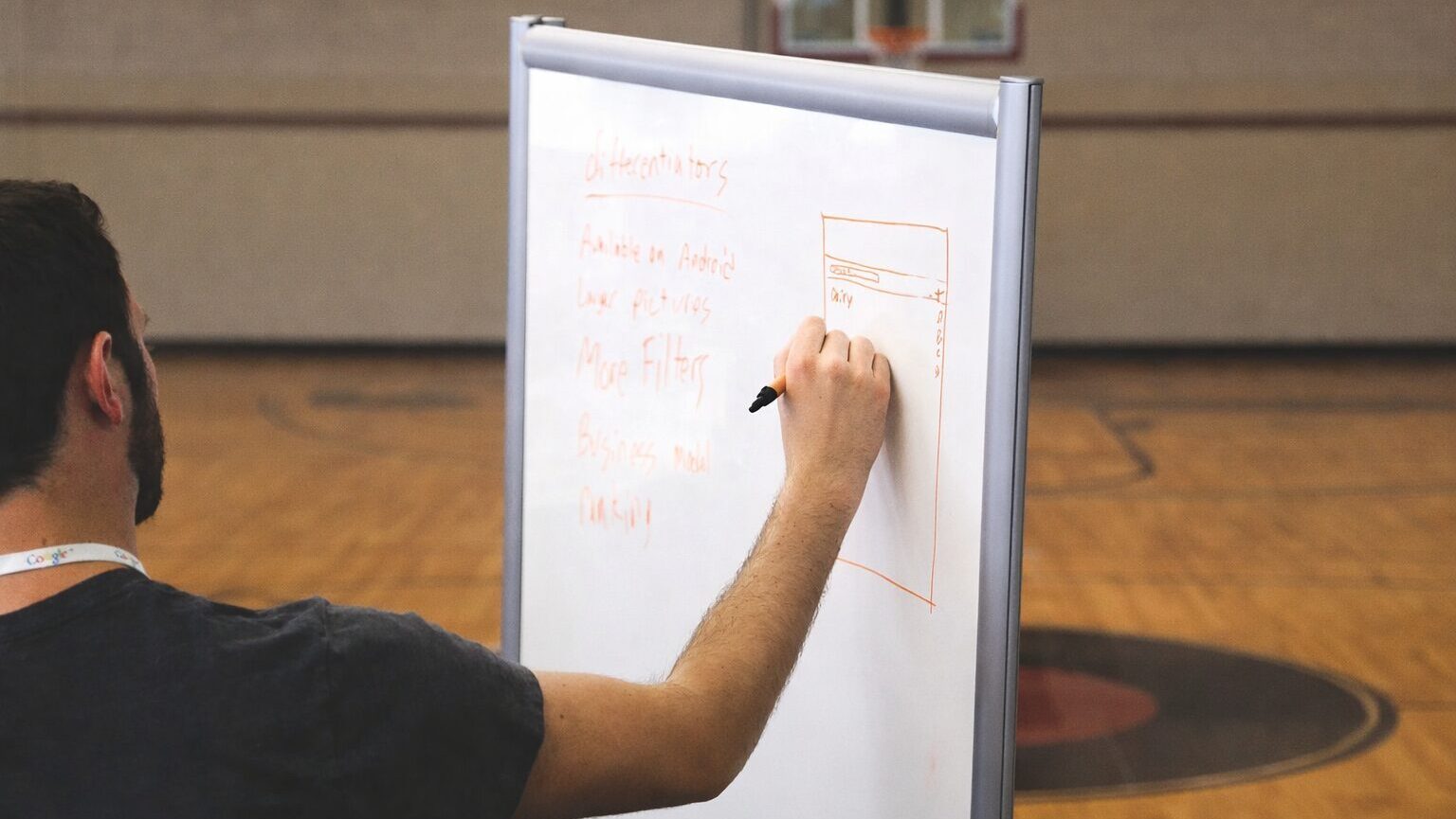 共有したいのは、まずは人の動きだけです。キーワードを話しながら、書いていきます。